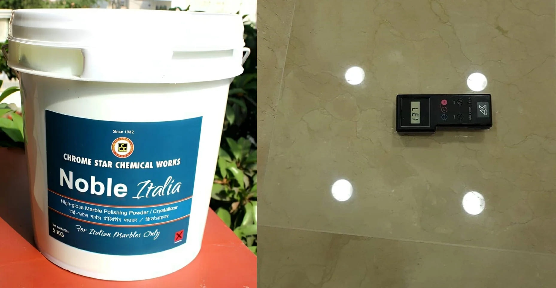 Bought Noble and Noble Italia for 7 Star Hotel Property as recommended by one of my colleagues. Reflection of Marble Surface after Polishing is wonderful. Very Good Shine, highly satisfied with it.